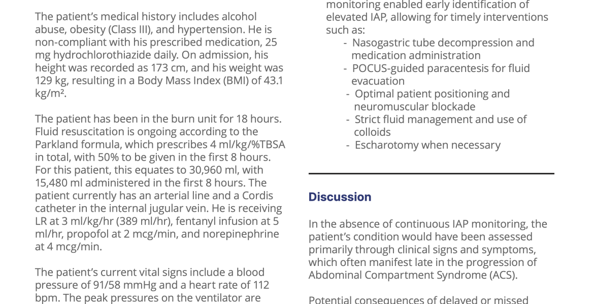 A 55-year-old man with severe burns covering 70% of his body was admitted to the trauma unit, requiring urgent care. The case highlights how continuous Intra-Abdominal Pressure (IAP) monitoring with TraumaGuard helped detect life-threatening complications early, allowing for proactive interventions and better outcomes. Learn how this critical tool enhances burn care in real-time.