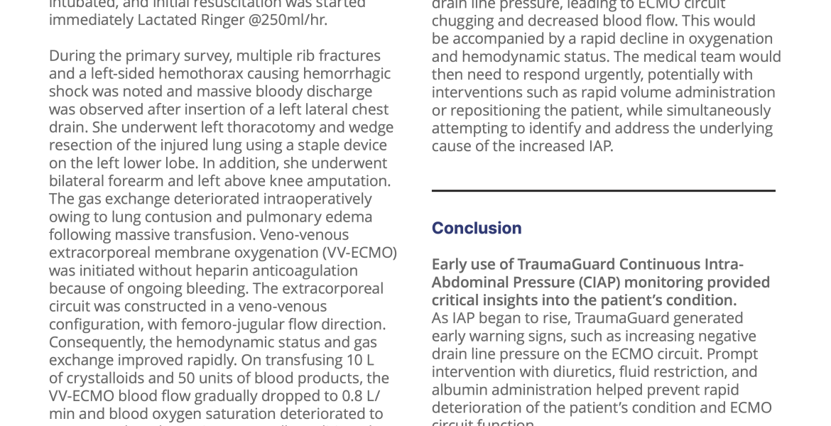 A 64-year-old woman suffered severe injuries from a train accident, requiring ECMO support. Continuous IAP monitoring with TraumaGuard provided real-time data, enabling early interventions that stabilized her condition and prevented further complications. Discover how TraumaGuard played a critical role in managing this high-risk case and improving outcomes.